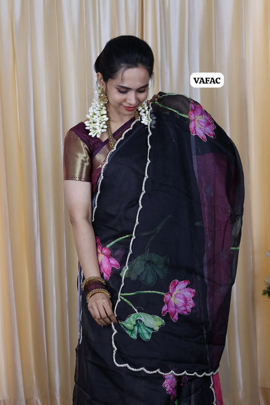 Soft organza with floral design and cut work scallop border along with handwork and pearl work 😍🥳
