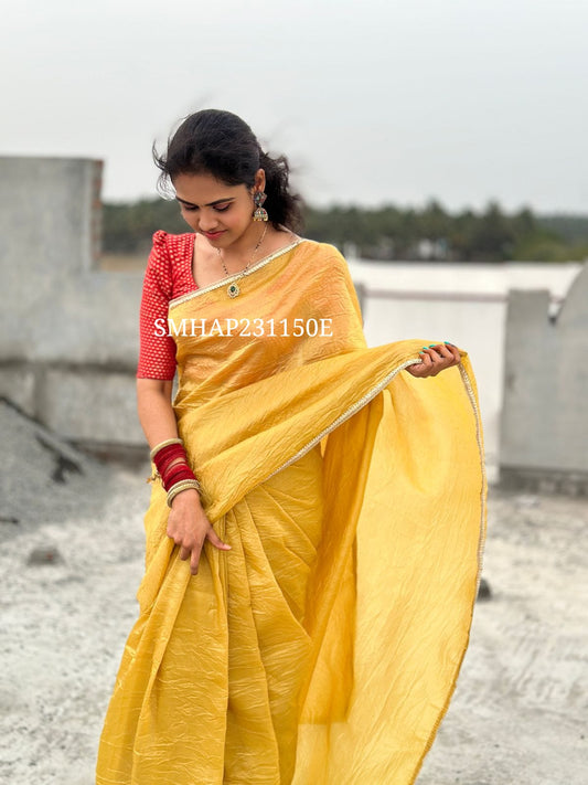 saree+ Red banaraai silk blouse. Fancy soft CrushTissue Silk saree with golden Lace.YYY