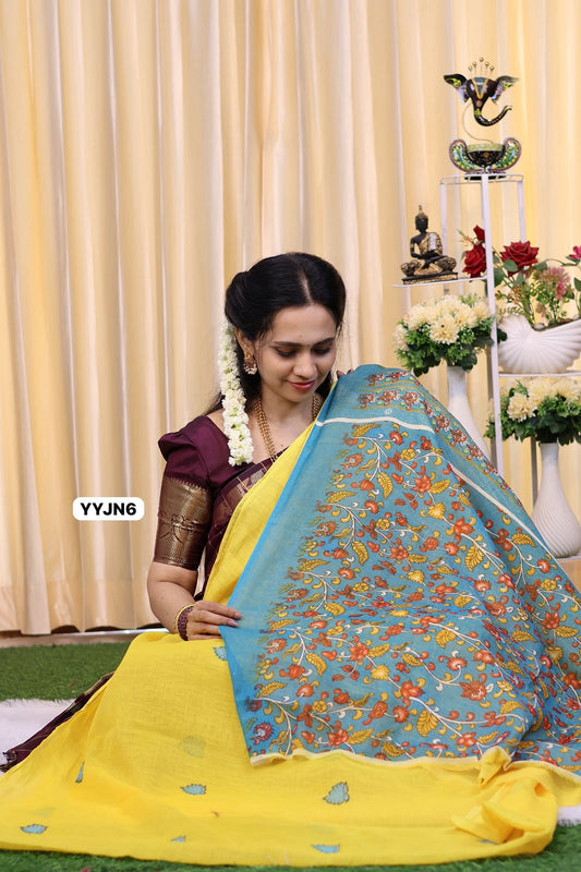 Soft Chanderi cotton With Digital Print & Running Kalamkari Blouse. Pallu Stiched With Fumka🥳