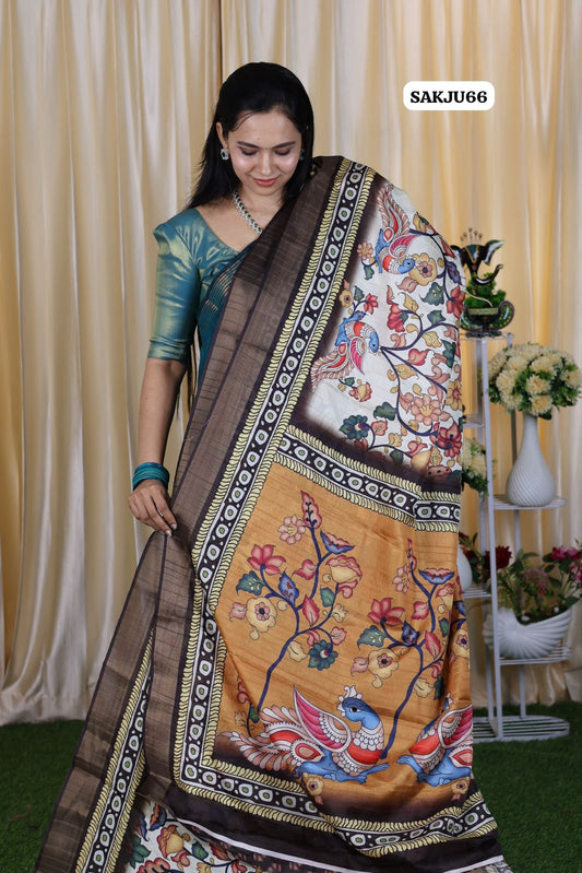 Rich Kalamakari print in tussar art silk beautiful brown color 🥳