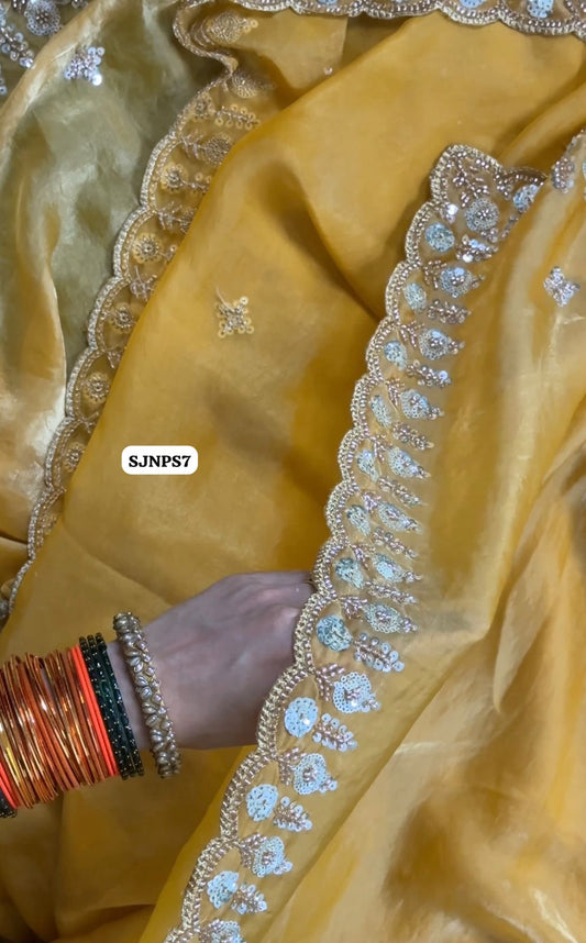 Chinnon silk saree with readymade blouse .heavy handwork zardosi and organza rose petals - 🥳
