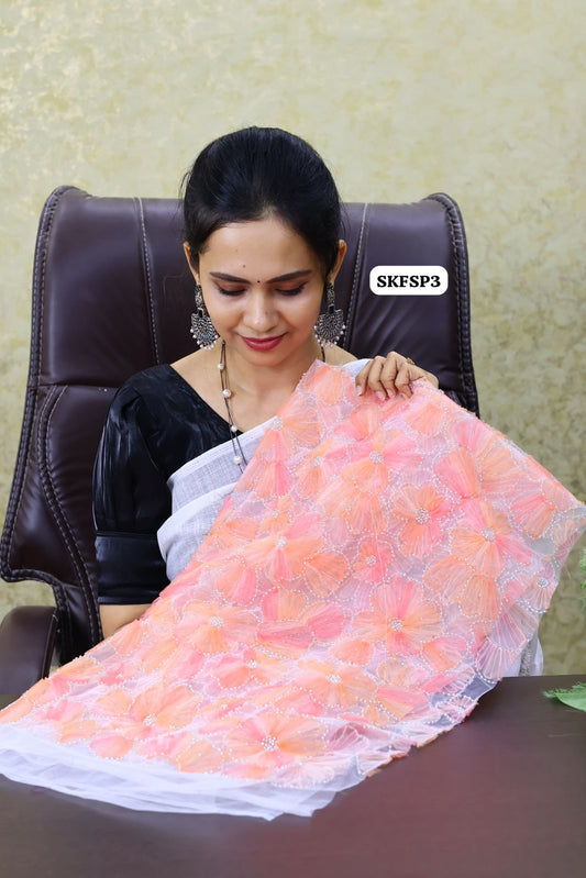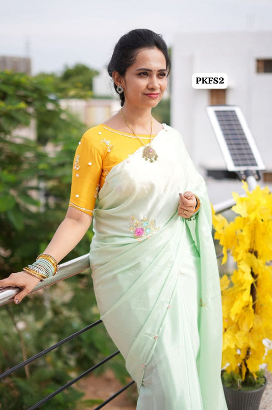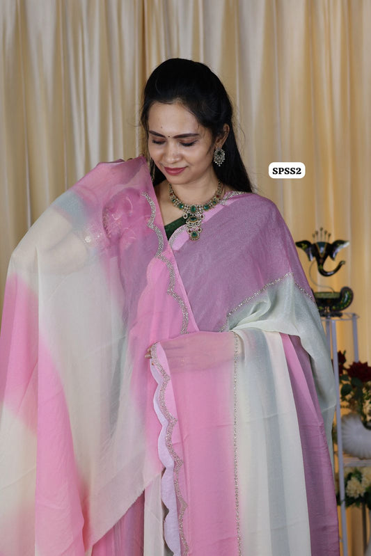 Chinnon silk saree with readymade blouse .heavy handwork zardosi and organza rose petals - 🥳