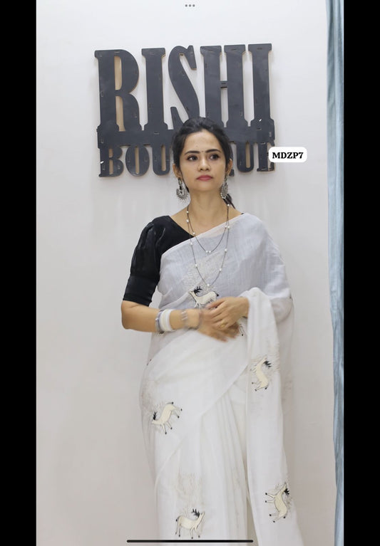 Soft linen saree with embroidery work with tassels stitched 🥳prebook 20-25 days