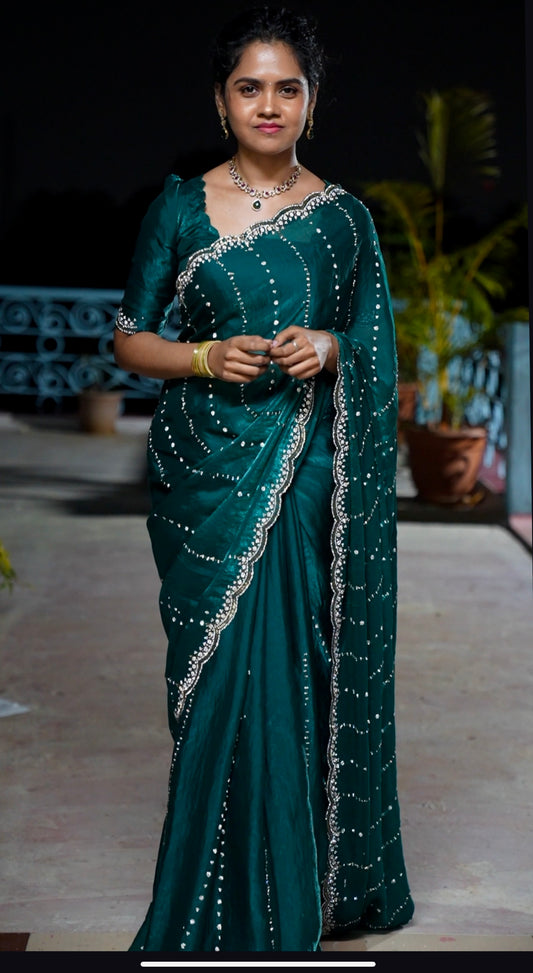 Satin chiffon dual colour shaded saree with embroidery & sequence work with scalloped cutwork embroidered border and running blouse🥳