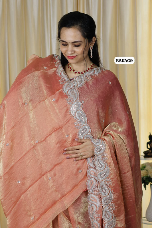 Soft & smooth jimmy cho satin with gold zari embroidery & sequence work with scalloped cutwork border with unstitched embroidery work blouse🥳