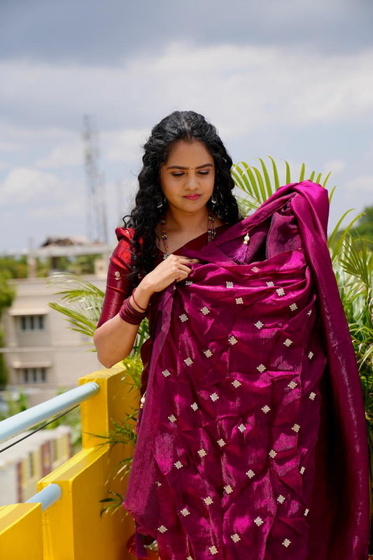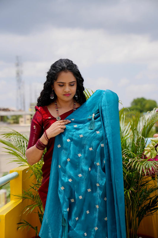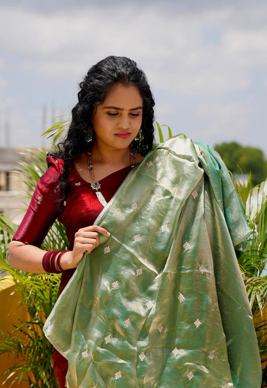 Space silk tissue sarees with heavy embroidery chumky work blouse unstitched 🥰😎🥳