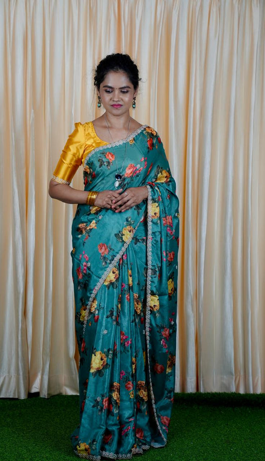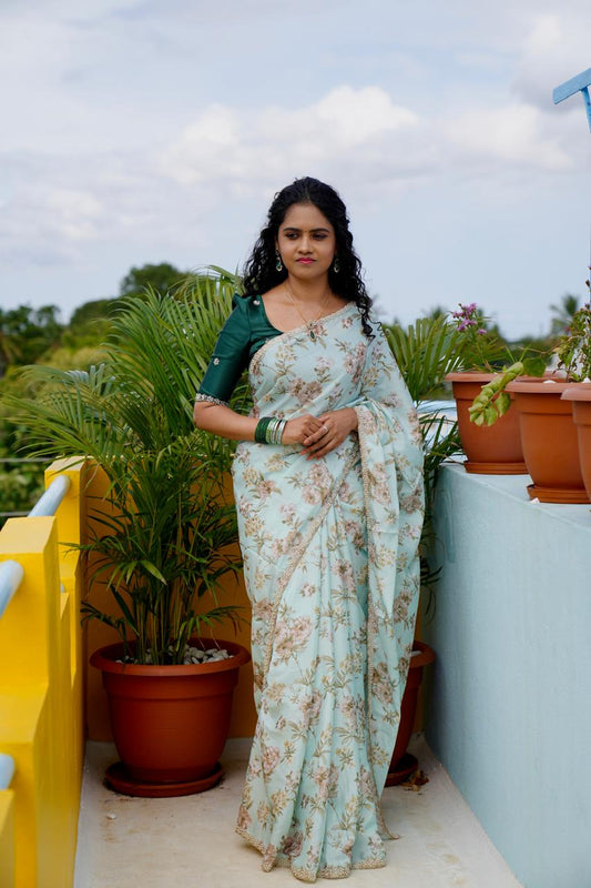 Chinnon digital printed saree with Pearl work and Cutwork border.(Prebook)🥳⏰ prebook