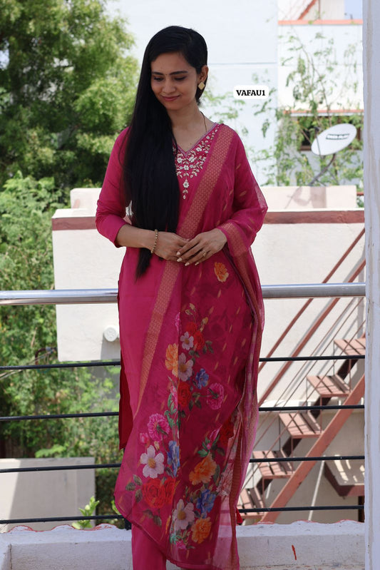 Premium Roman Silk Kurti Pant Dupatta Set with handwork and Chanderi digital print dupatta🥳
