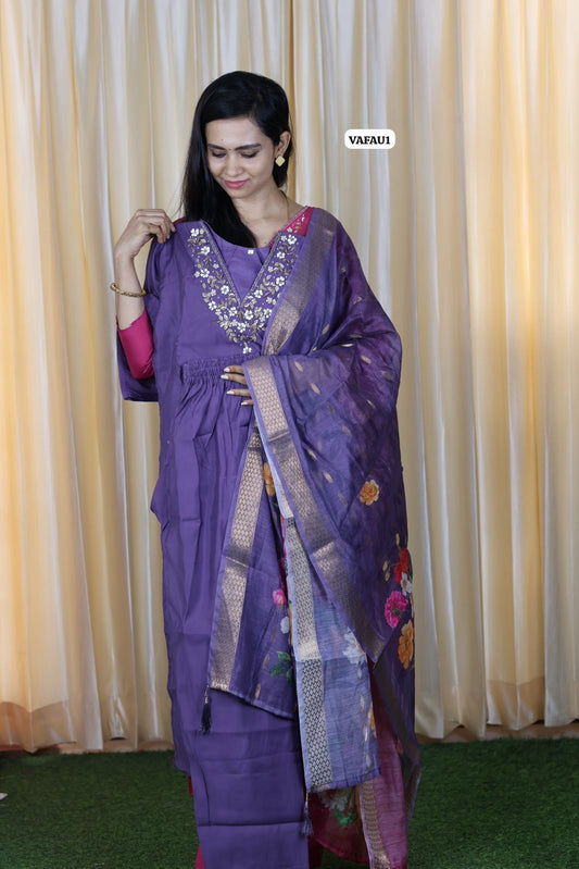 Premium Roman Silk Kurti Pant Dupatta Set with handwork and Chanderi digital print dupatta 🥳