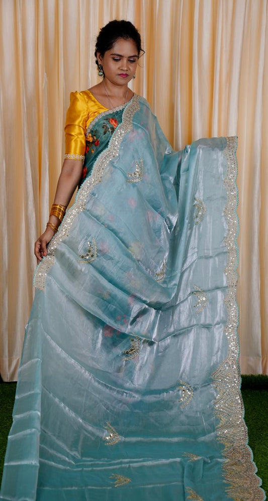 Space silk tissue sarees with heavy embroidery chumky work blouse unstitched 🥰😎🥳