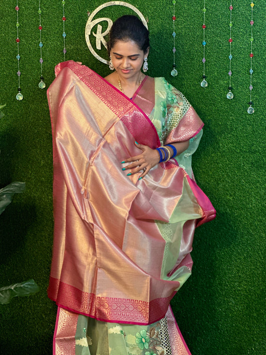 Heavy Banarasi oraganza pure zarkan work with complete temple border with blouse offer😍