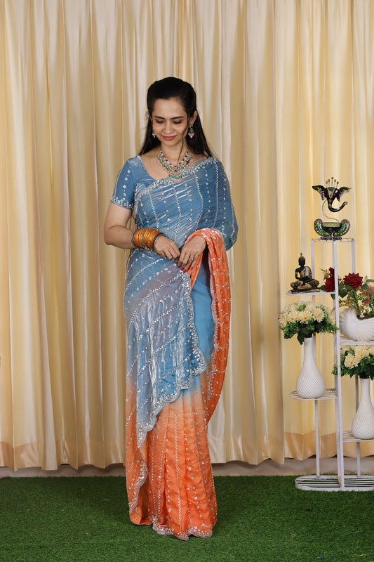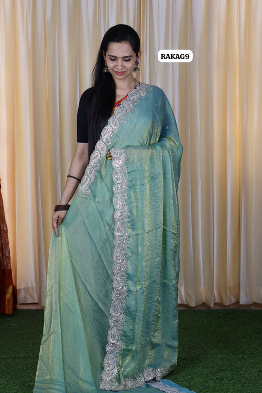 Space silk fabric with real stone work butterfly done on border with running blouse🥳prebook 20-25 days