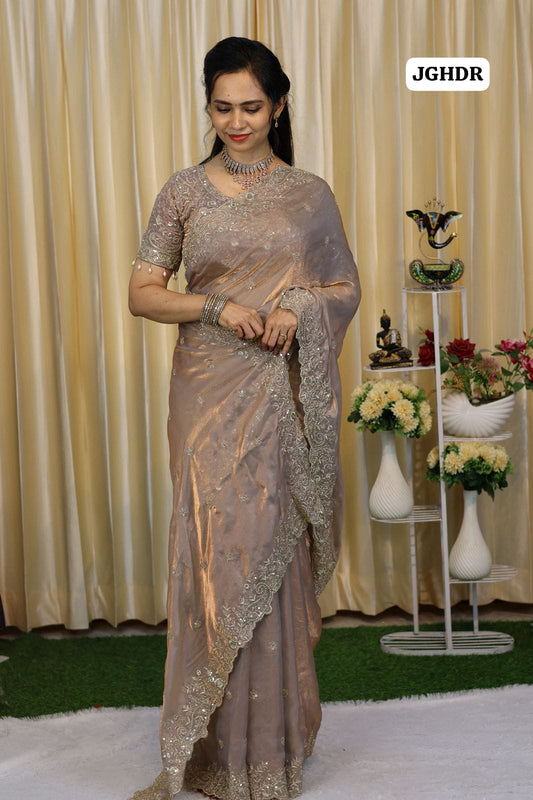 Soft Space silk gold zari floral design embroidery & sequence work with scalloped cutwork border Paired with Contrast embroidery & sequence work blouse👇