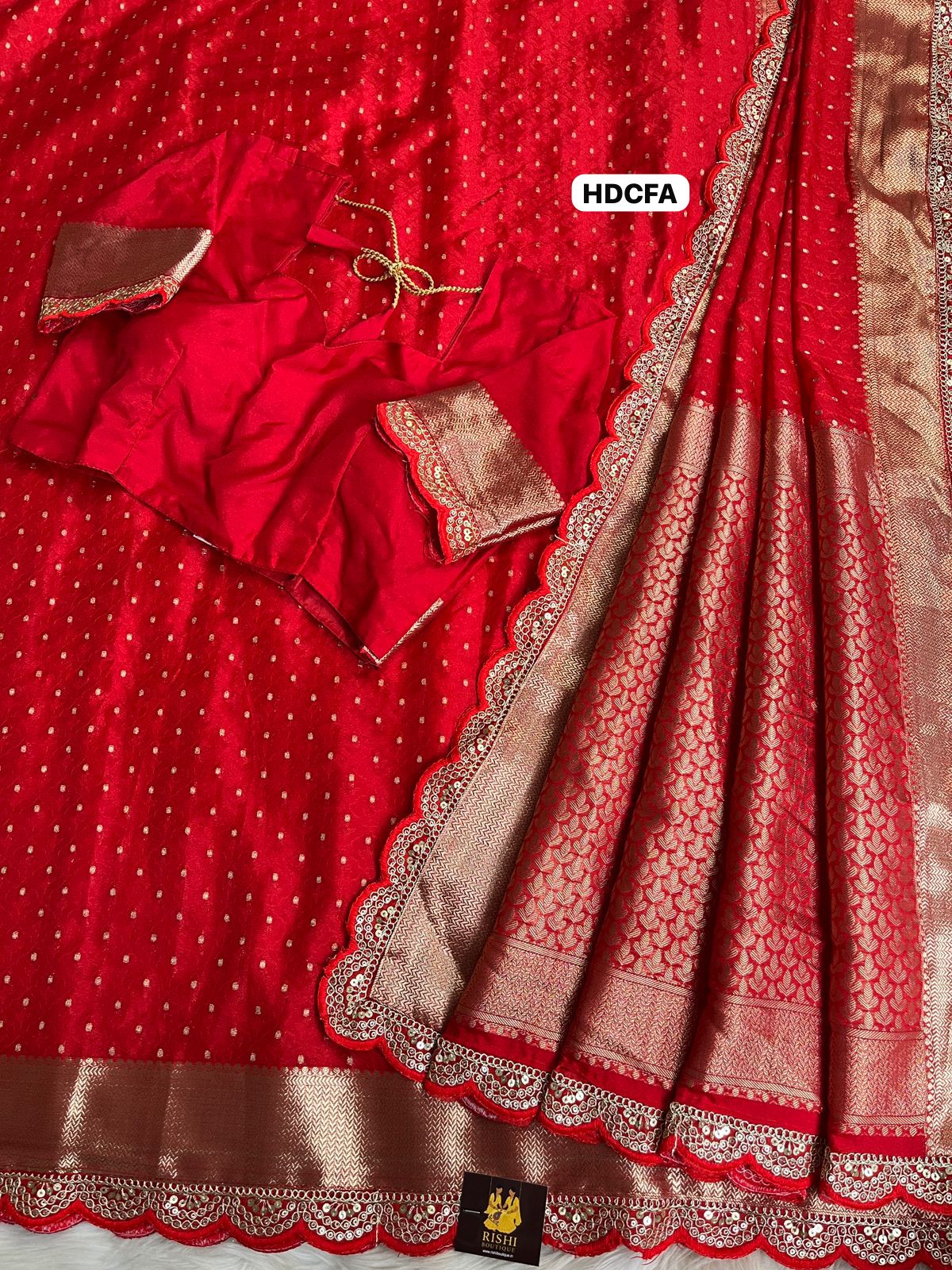 Khadi Georgette saree with beautiful gold zari weaving comes with rich weaving pallu having trending embroidery work lace border And running blouse