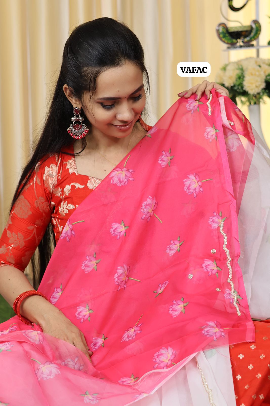 Soft organza with floral design and cut work scallop border along with handwork and pearl work